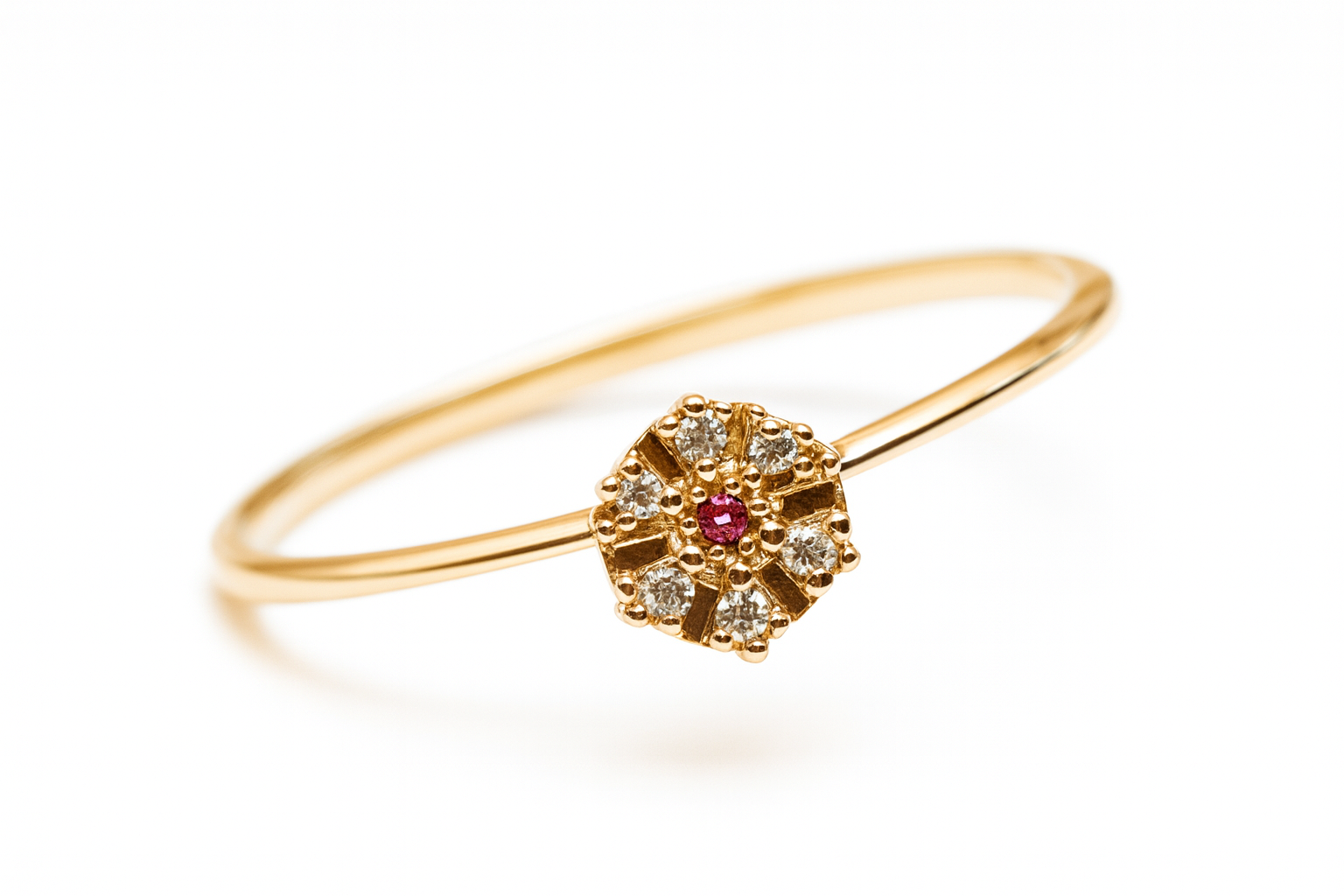 Anel chuveiro em ouro 18k com pedras naturais (brilhante, rubi e esmeralda).