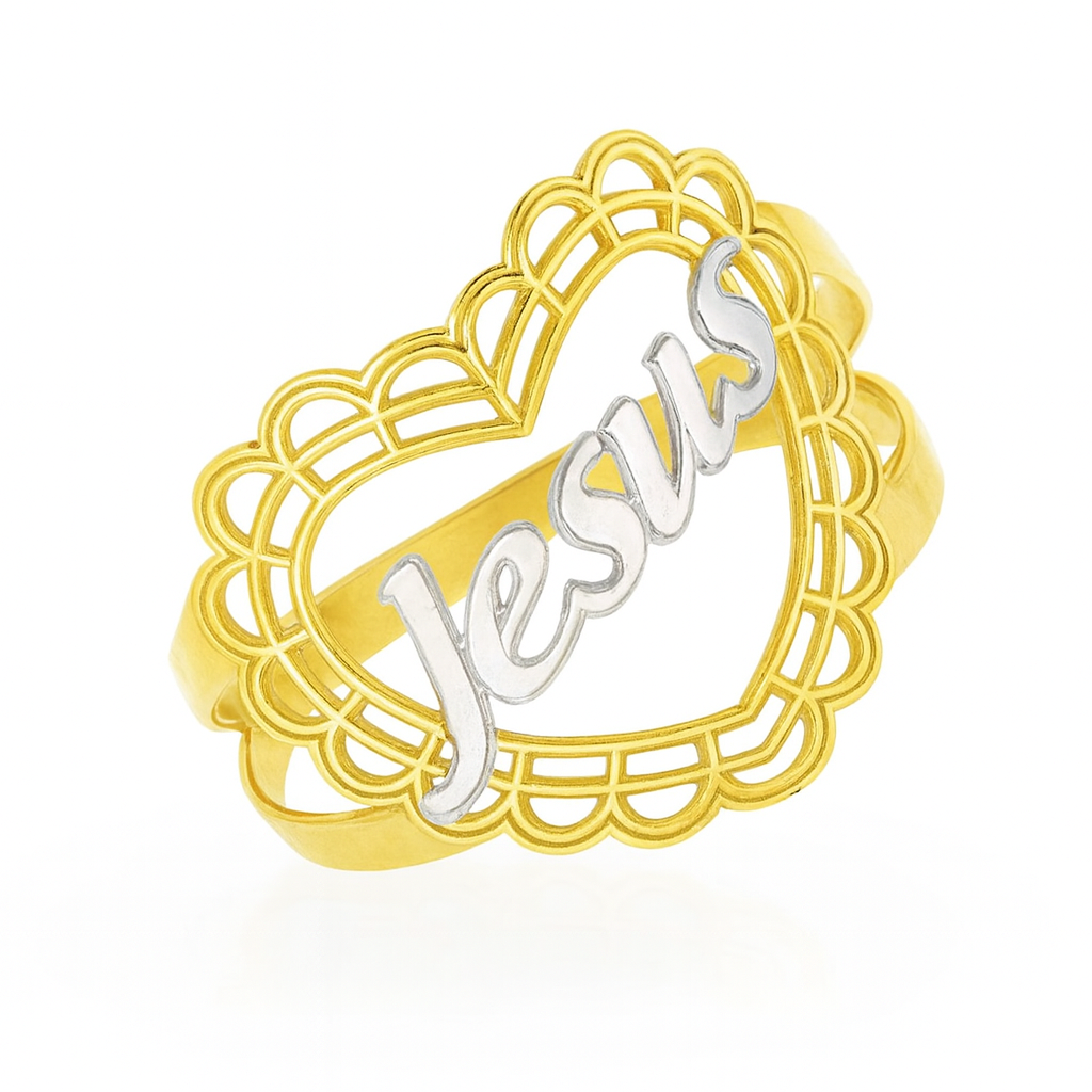 Anel coração em ouro 18k com nome Jesus em ouro branco.