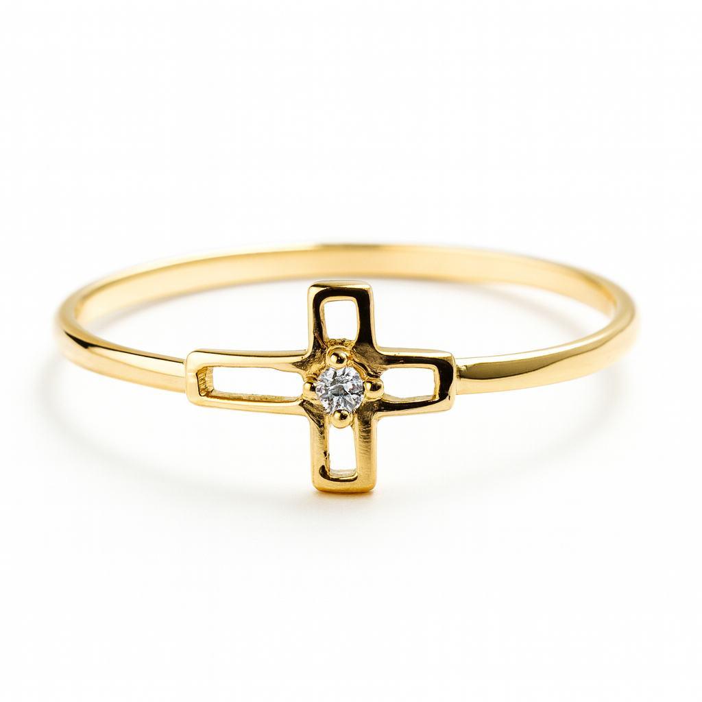 Anel cruz vazada em ouro 18k com 1 zircônia.