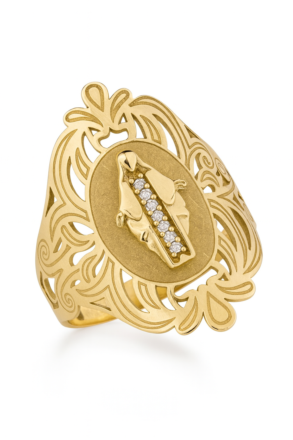 Anel Nossa Senhora das Graças em ouro 18k com 7 brilhantes.