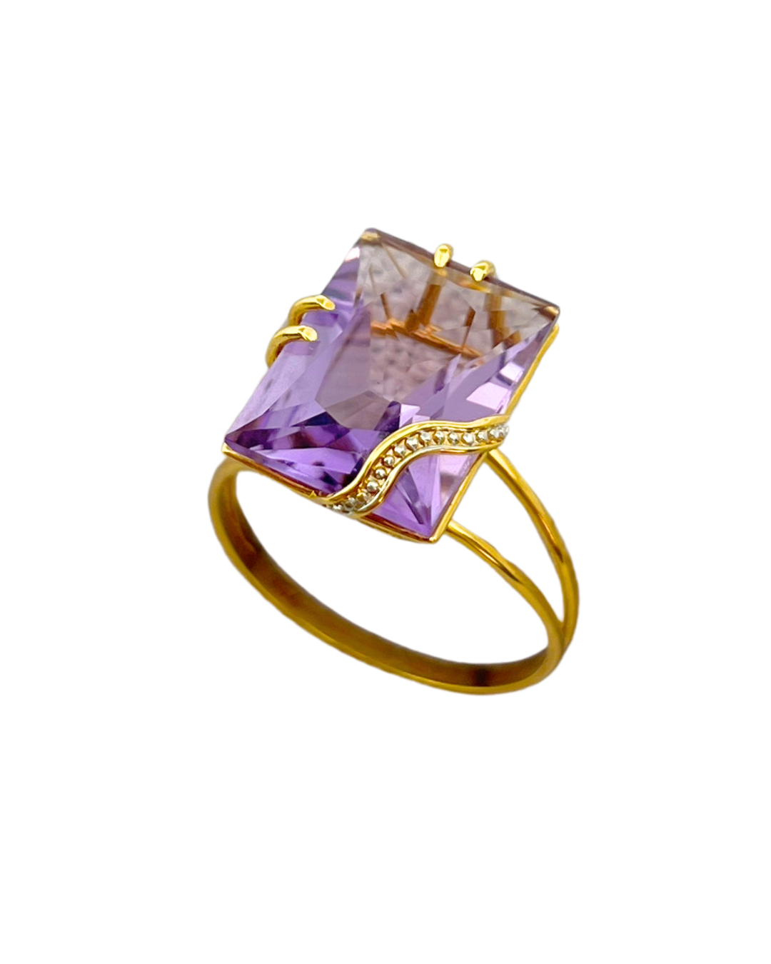 Anel e ouro 18k com pedra retangular Ametista e detalhe em ouro branco.