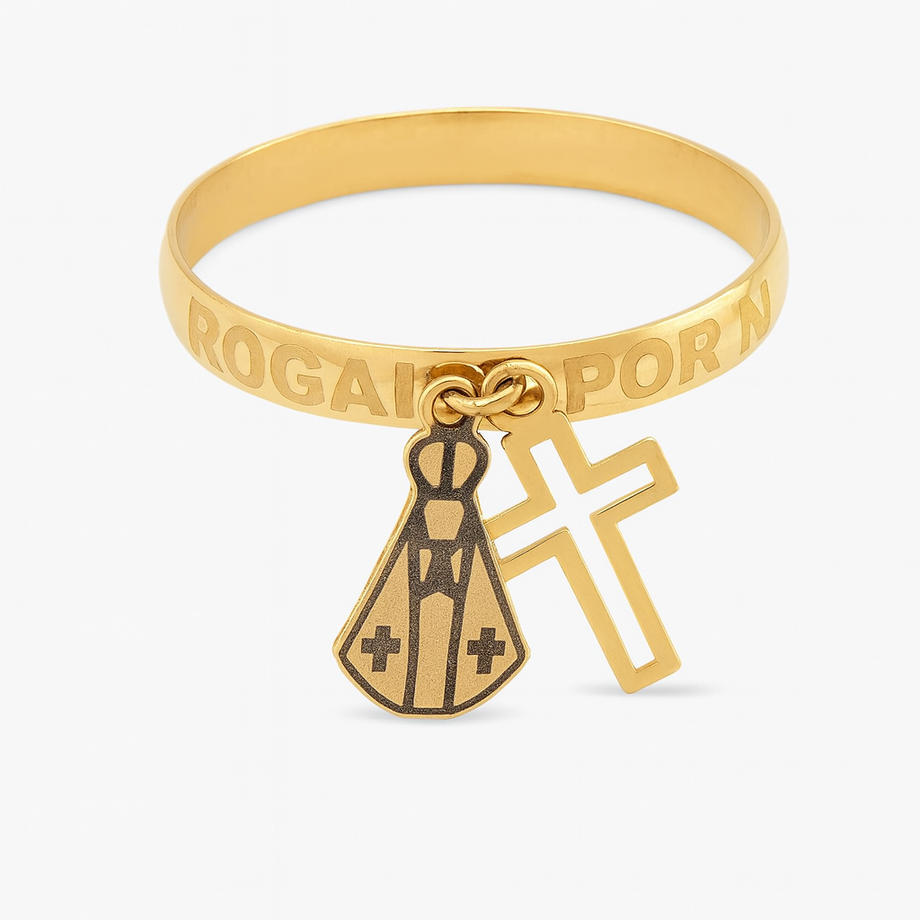 Anel “Rogai por Nós” com Nossa Senhora Aparecida e Cruz pendurados em ouro 18k.