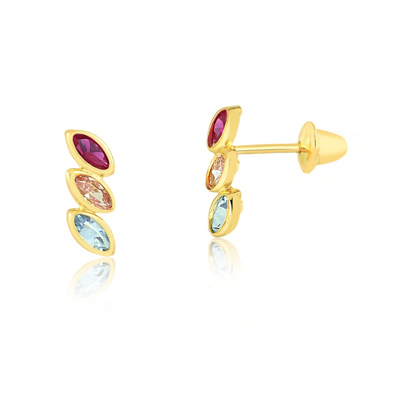 Brinco em ouro 18k com 3 zircônias navetes.