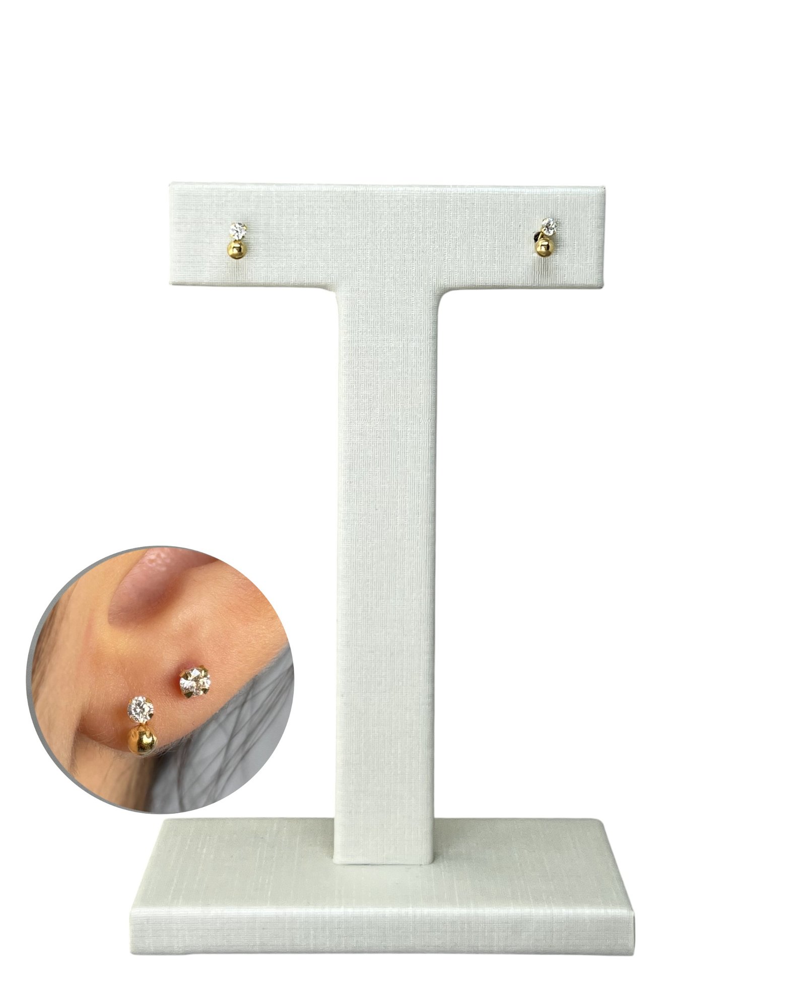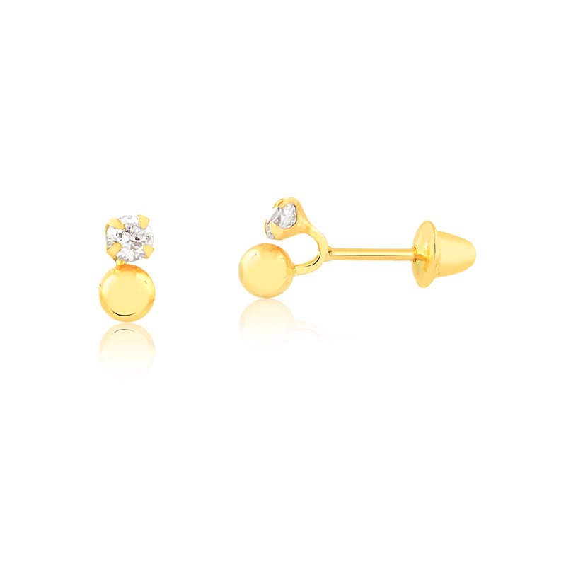 Brinco e bola em ouro 18k e pedra redonda de zircônia.