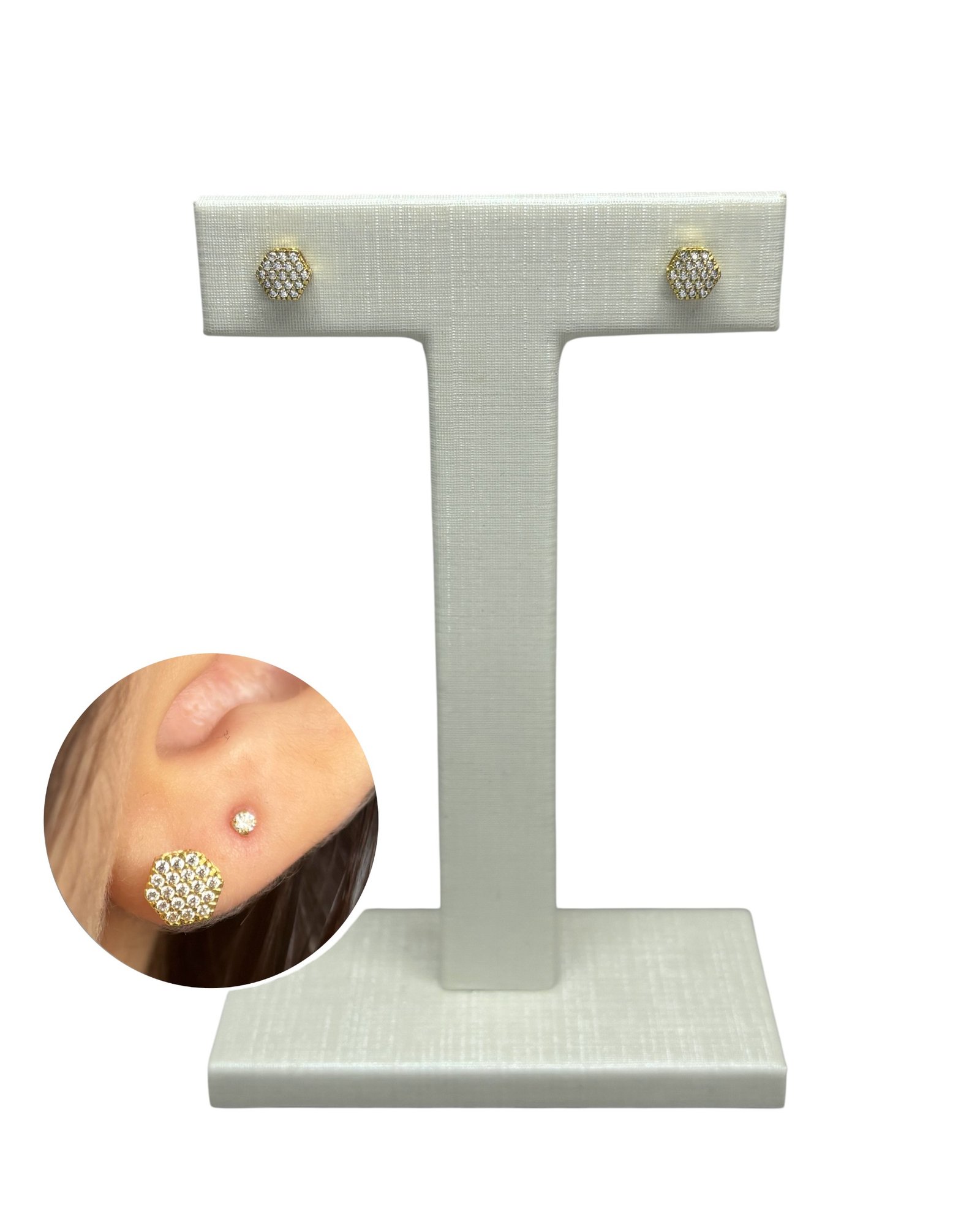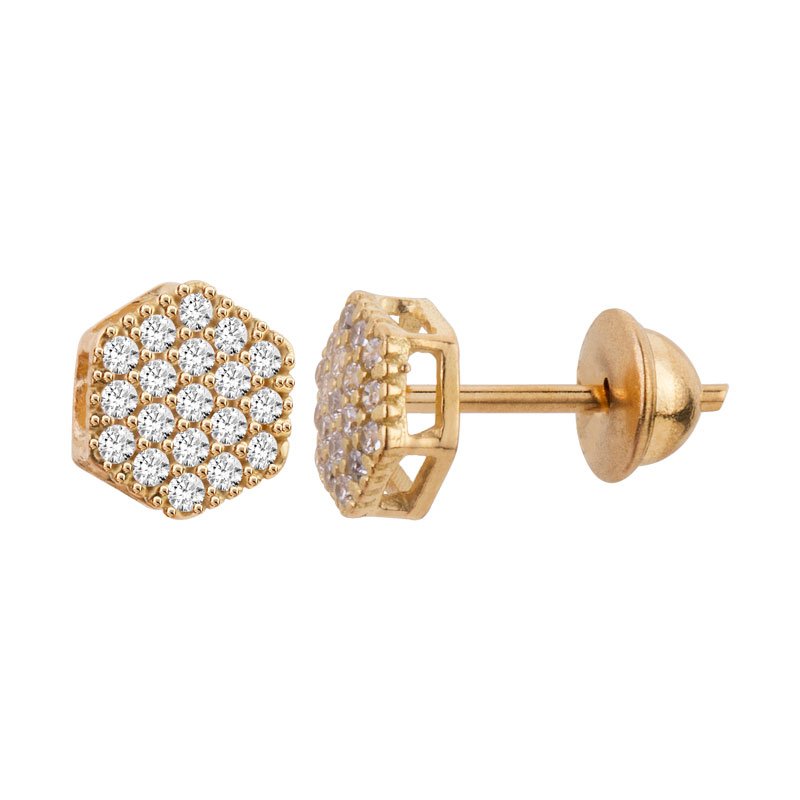 Brinco chuveiro sextavado em ouro 18k com zircônias.