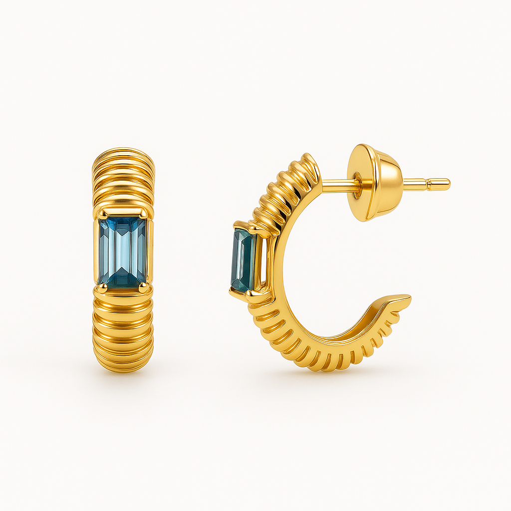 Brinco meia argola fios em ouro 18k com pedra natural Topázio.
