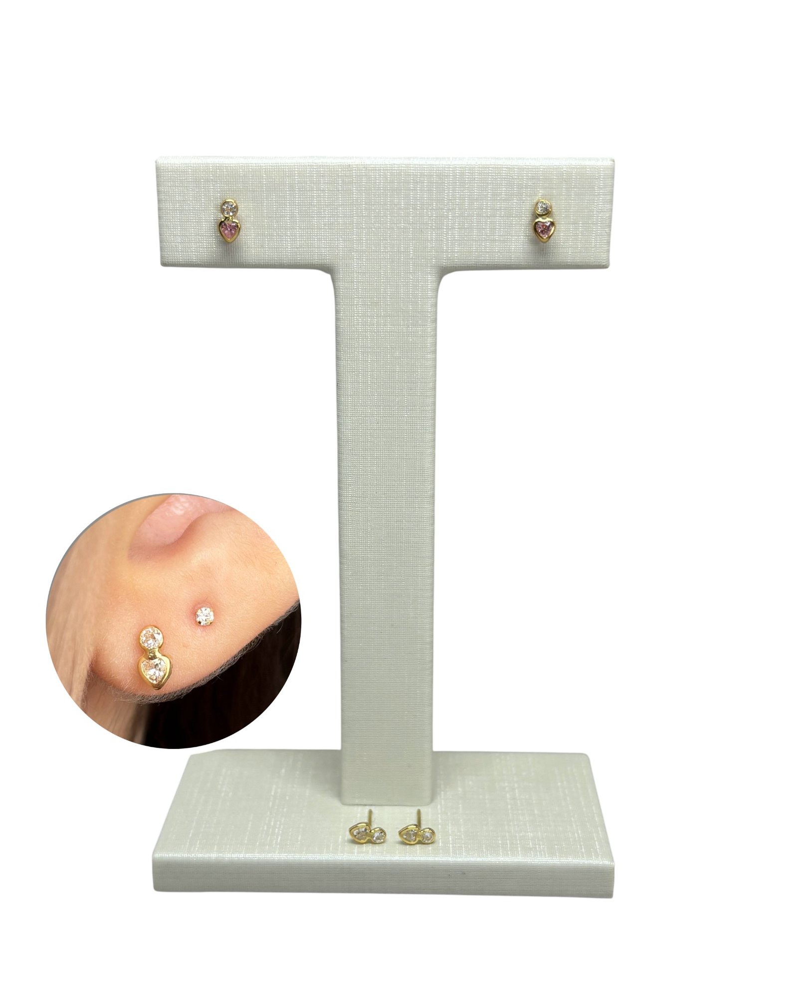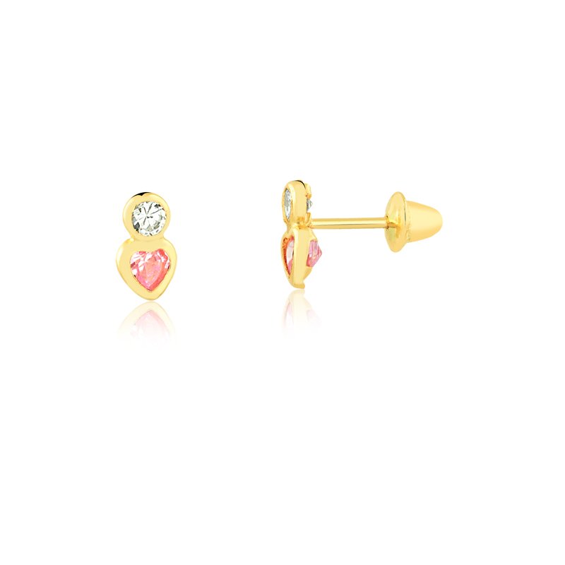 Brinco pedra e coração em ouro 18k com zircônias.