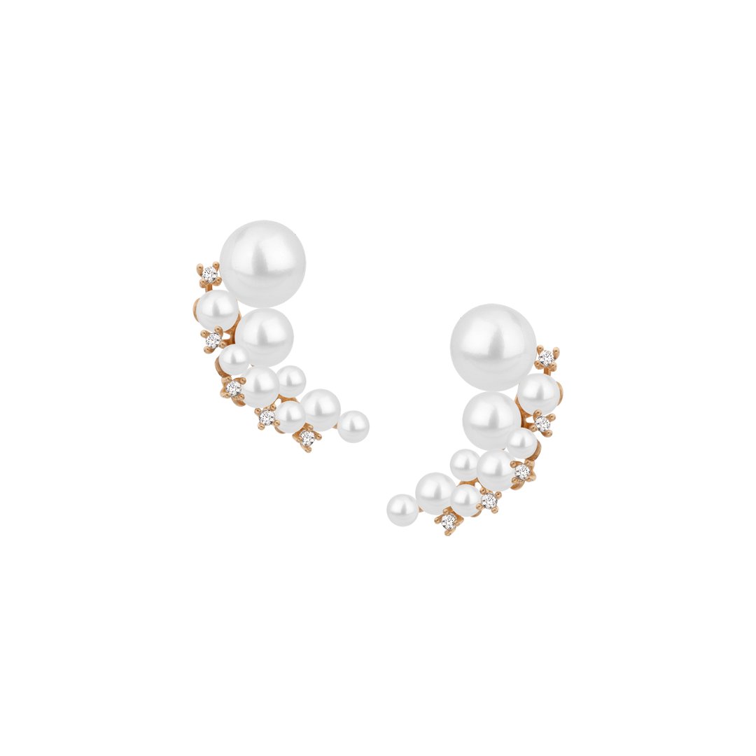 Brinco em ouro 18k com 18 pérolas e 10 safiras brancas.