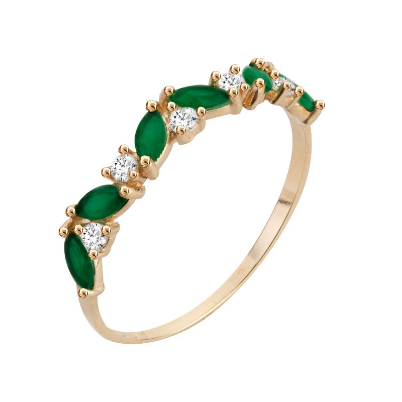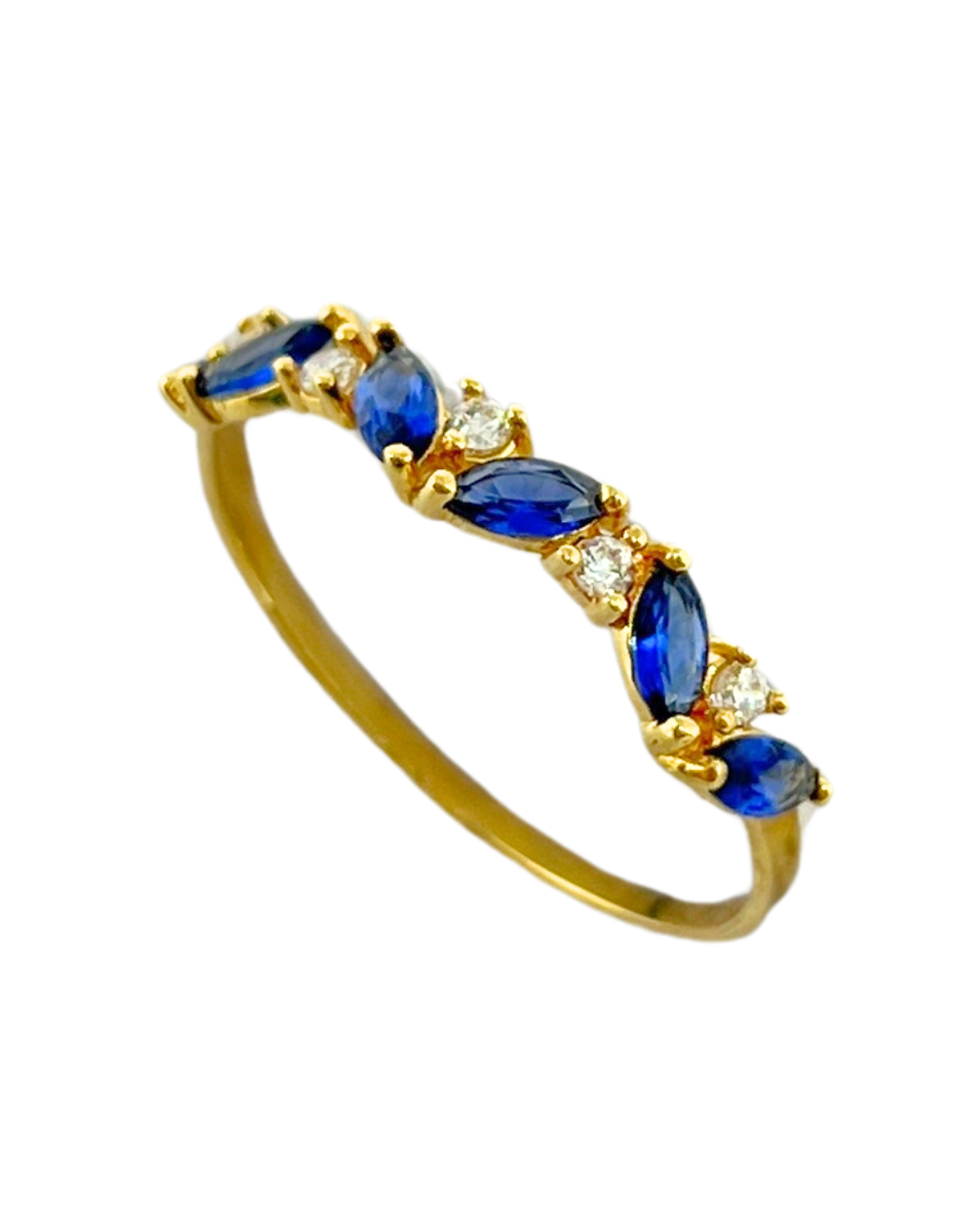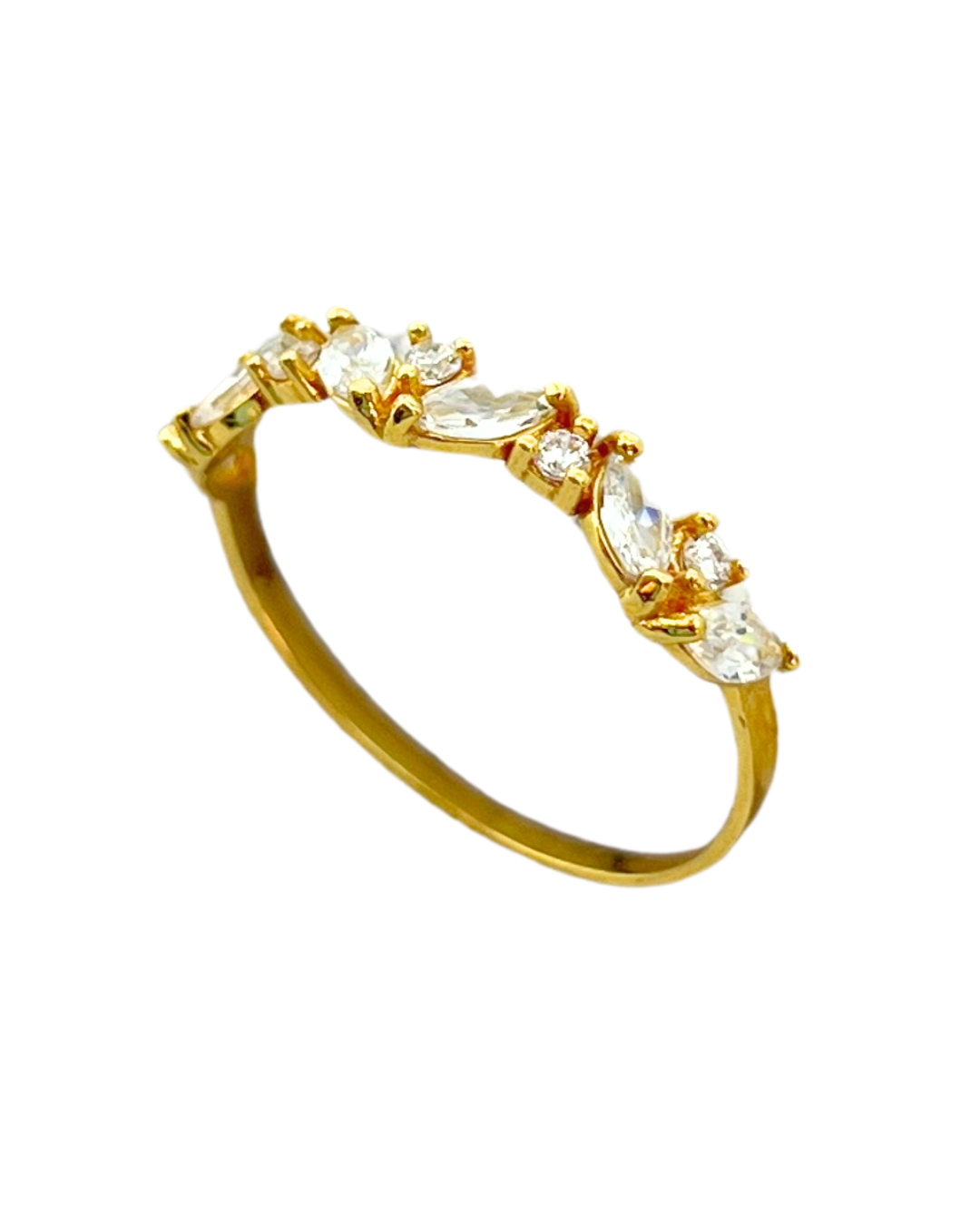 Meia aliança em ouro 18k com zircônias redondas e navetes.