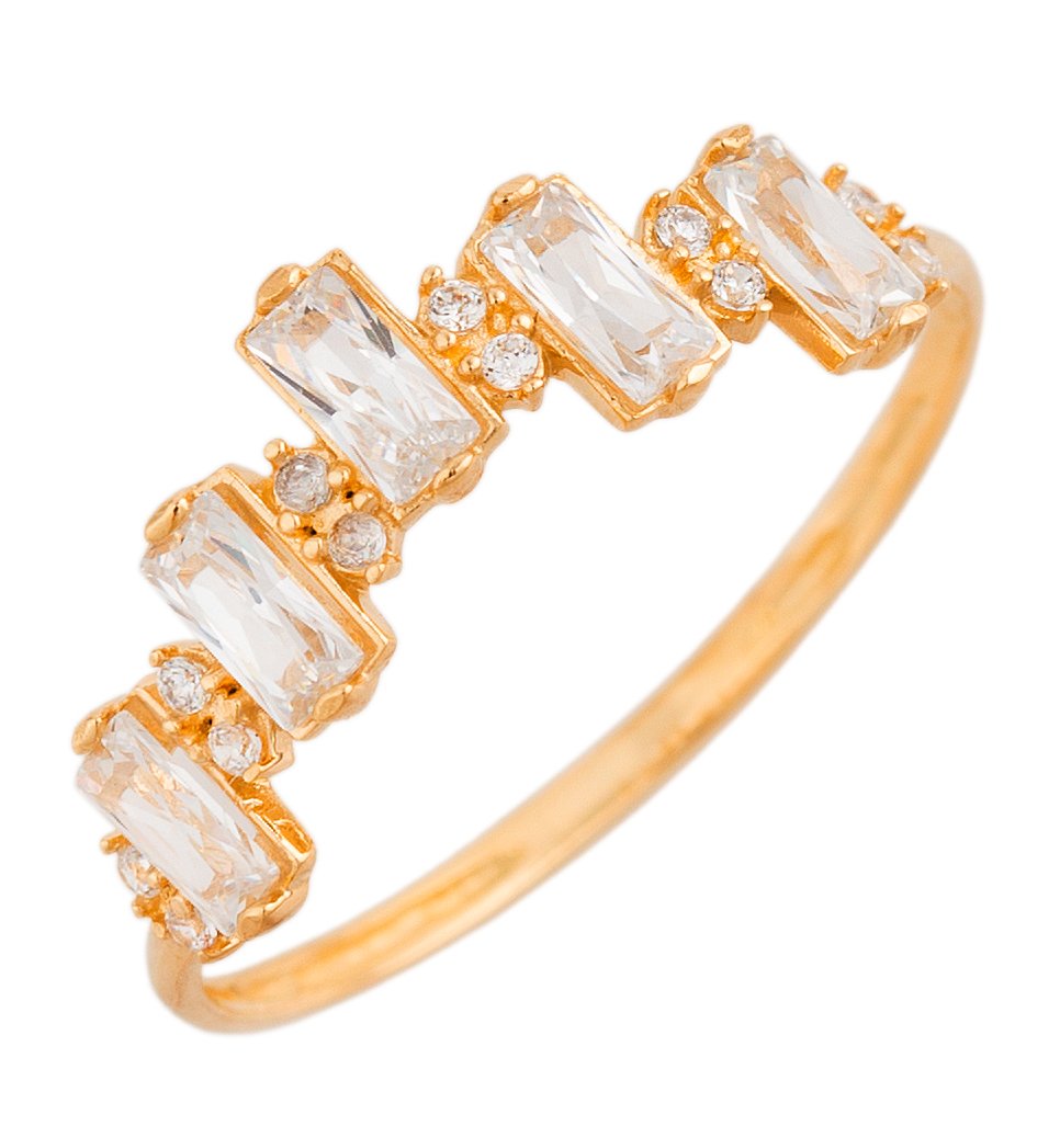 Meia aliança em ouro 18k com 5 pedras retangulares de 2x4mm e 12 pedras redondas em zircônias.