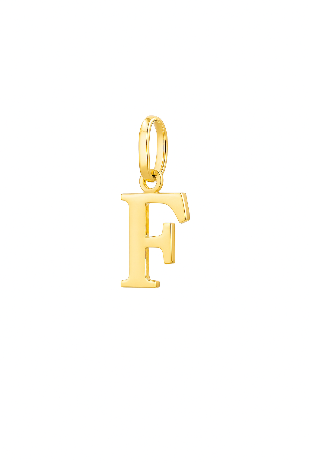 Pingente letra F medindo 8x7mm em ouro 18k.