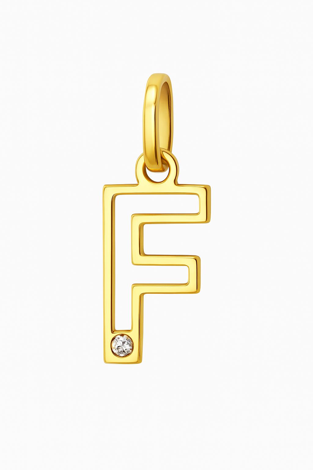 Pingente letra F vazada em ouro 18k com 1 brilhante.