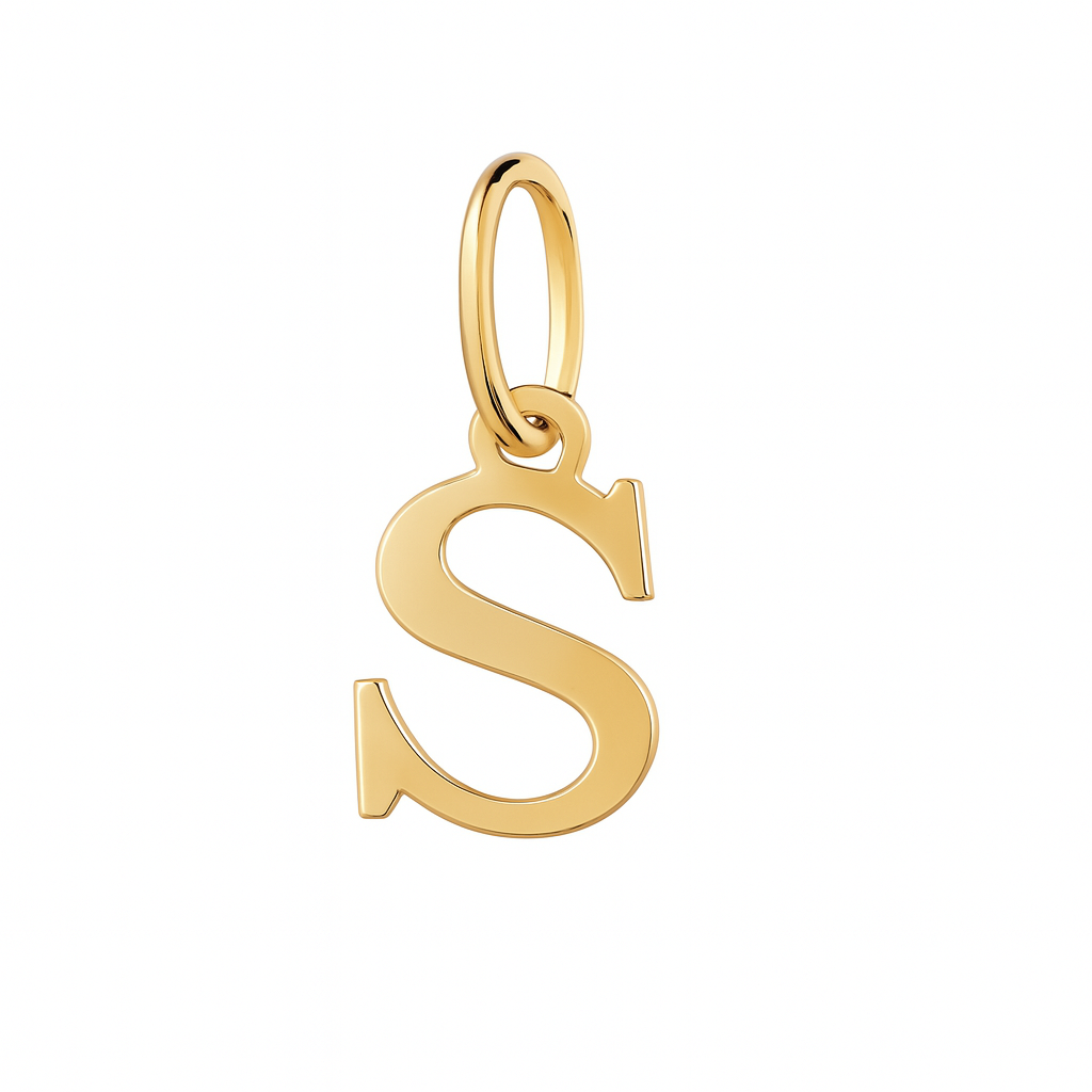Pingente letra S medindo 8x7mm em ouro 18k.
