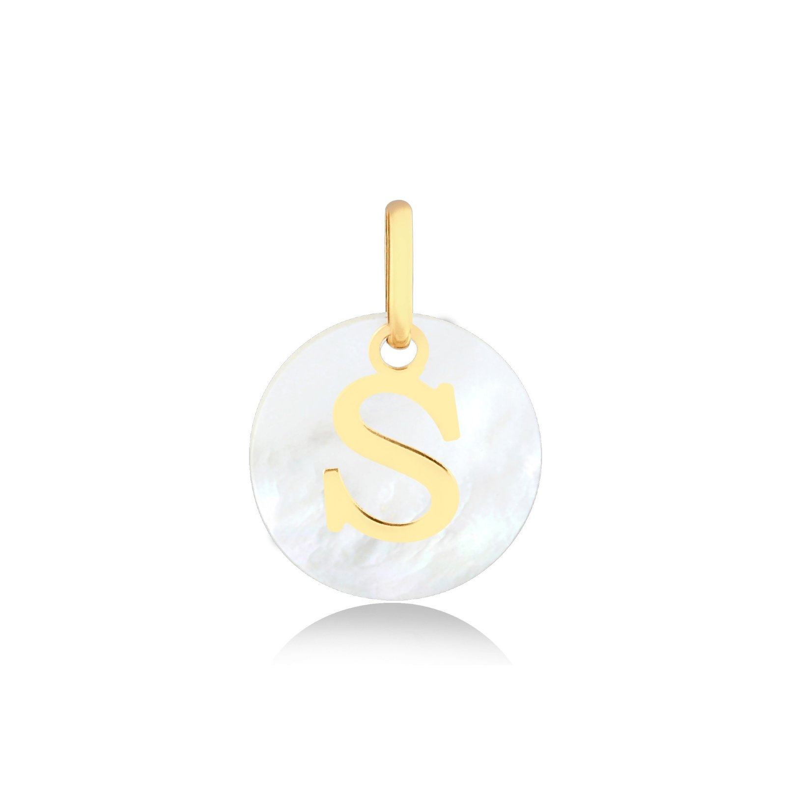 Pingente letra S em ouro 18k com madrepérola de 12mm de diâmetro.