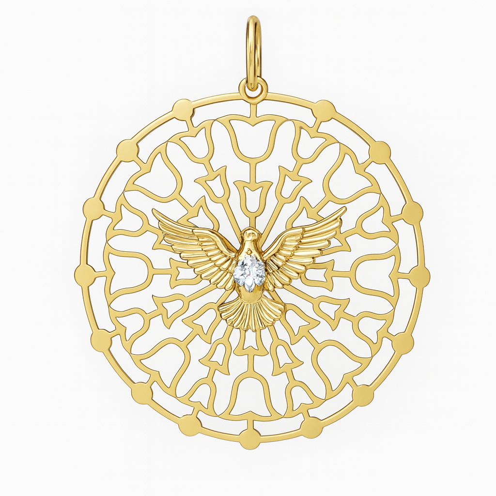 Pingente mandala Espírito Santo em ouro 18k com zircônias.
