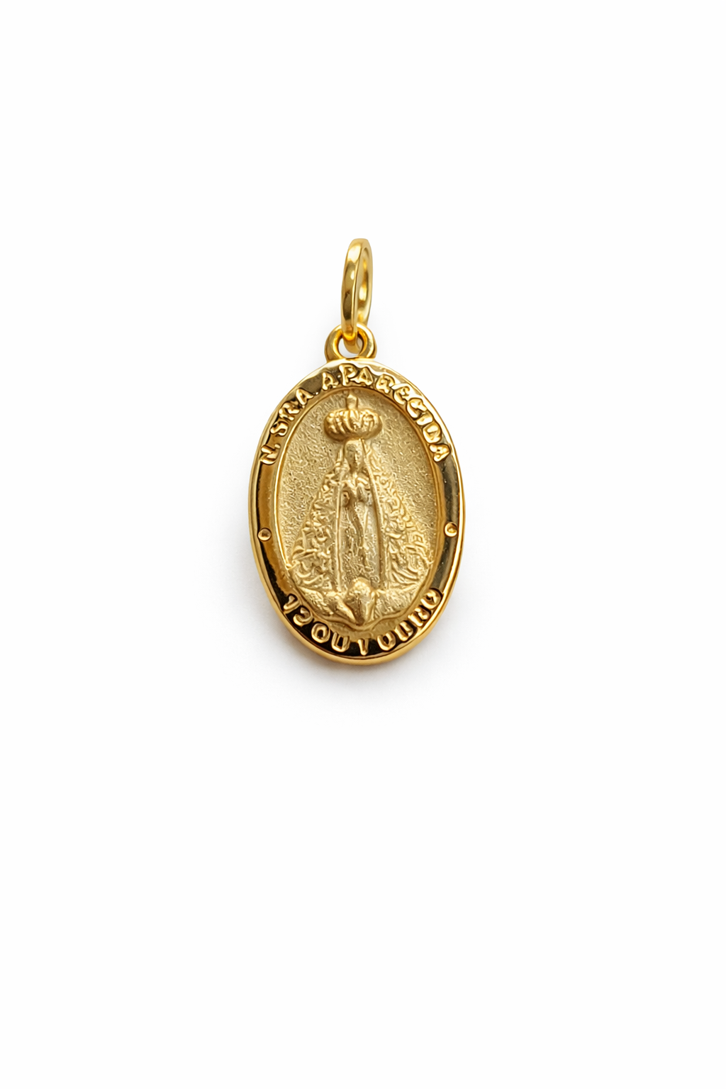 Pingente medalha Nossa Senhora Aparecida oval em ouro 18k.