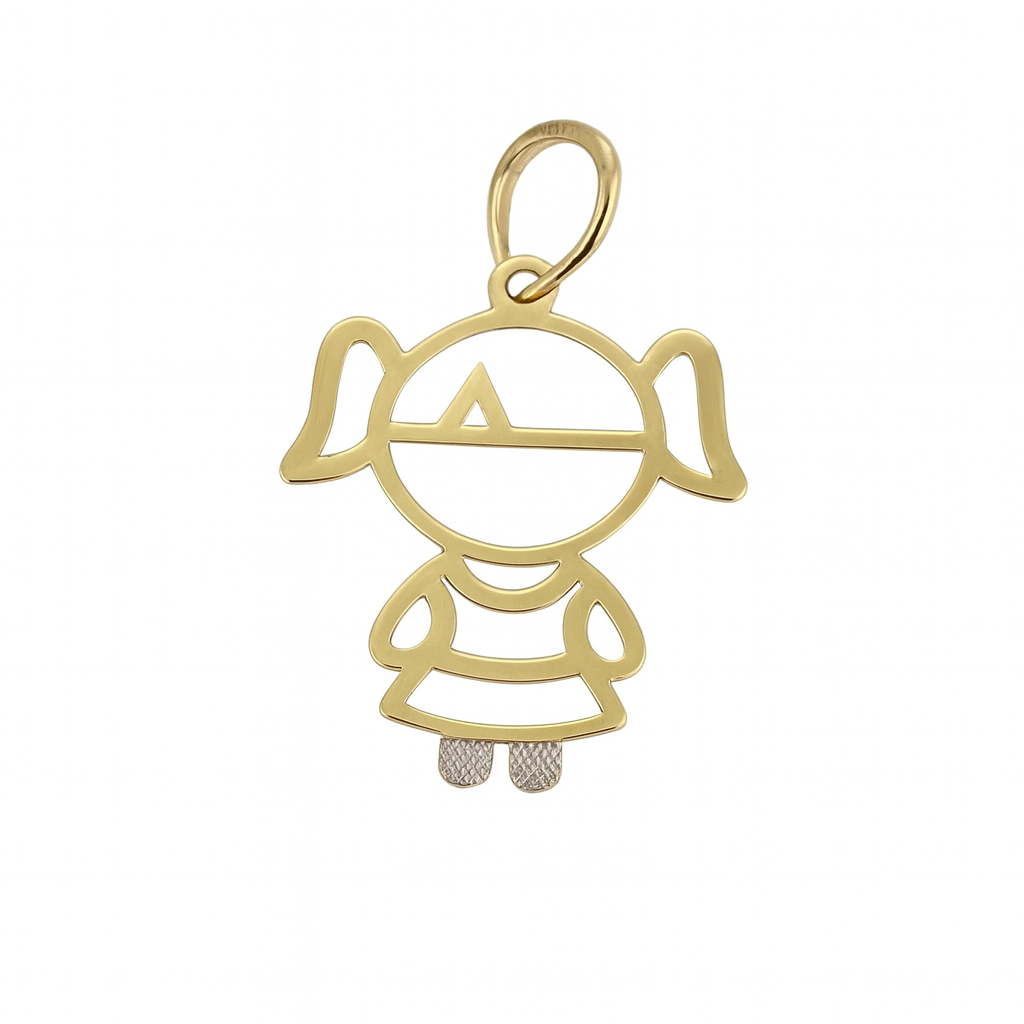 Pingente menina vazada em ouro amarelo 18k com pés em ouro branco.
