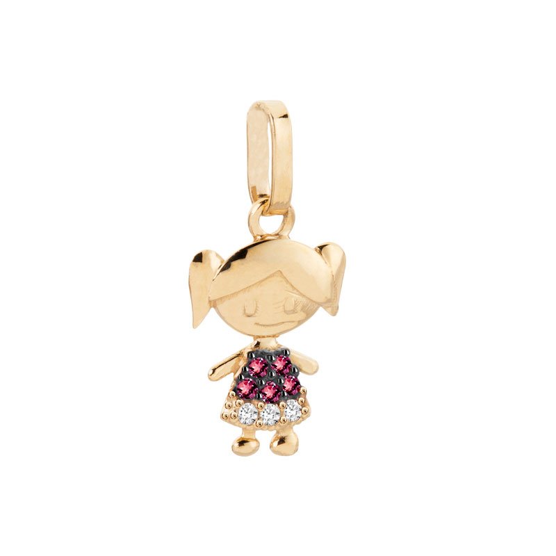 Pingente menina em ouro 18k com vestido em zircônias.