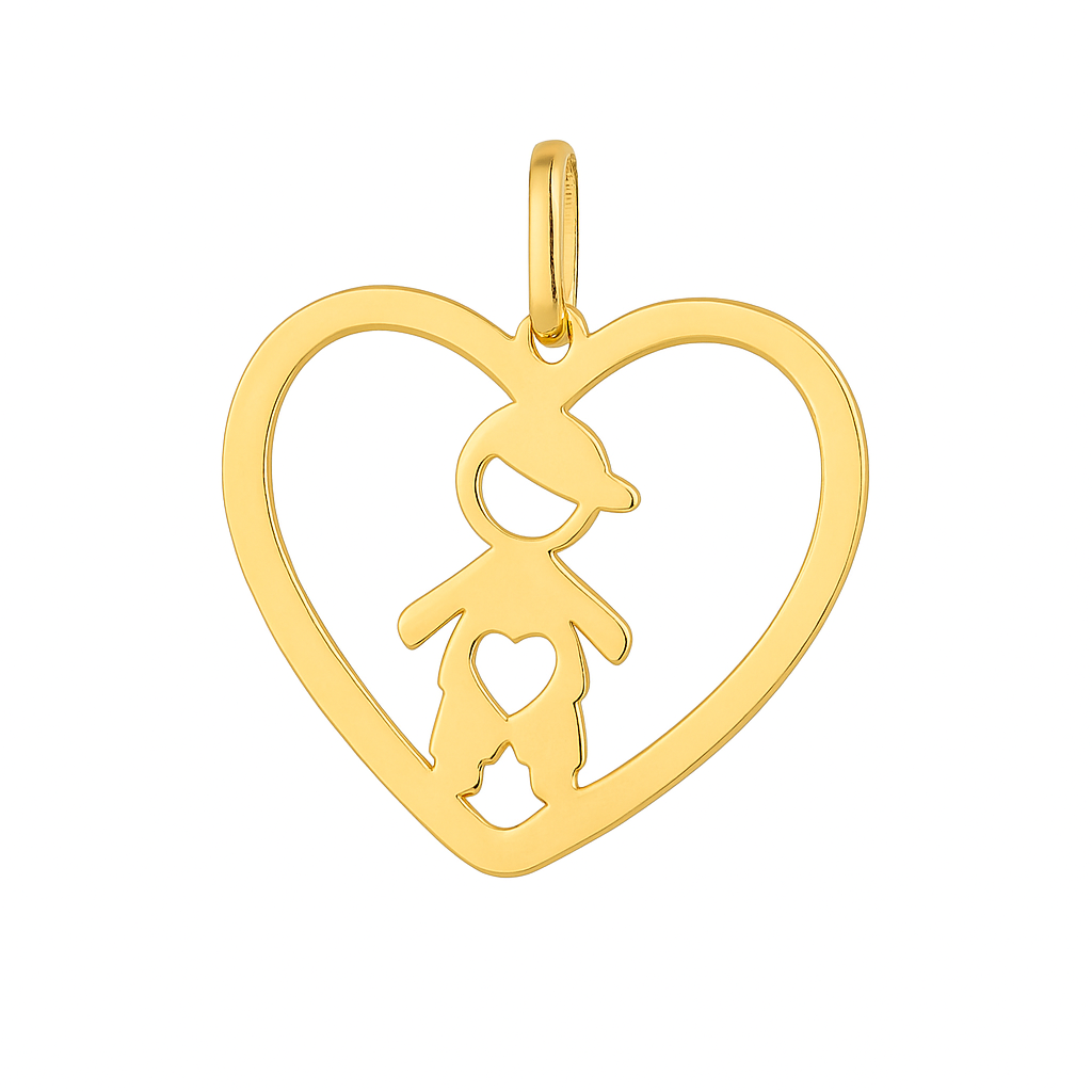 Pingente menino coração vazado em ouro 18k.