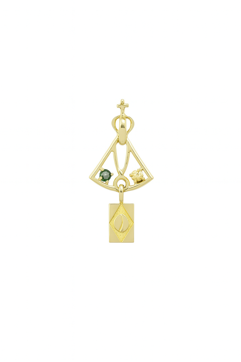 Pingente Nossa Senhora Aparecida com bandeira em ouro 18k com zircônias.