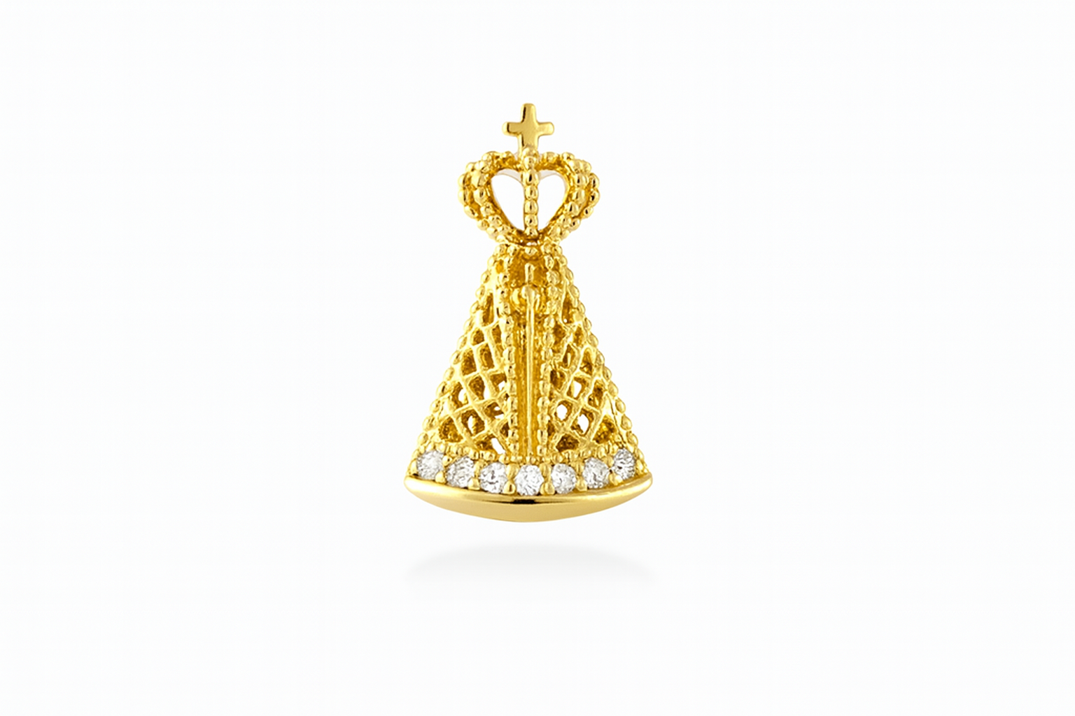 Pingente Nossa Senhora Aparecida diamantada em ouro 18k com zircônias.