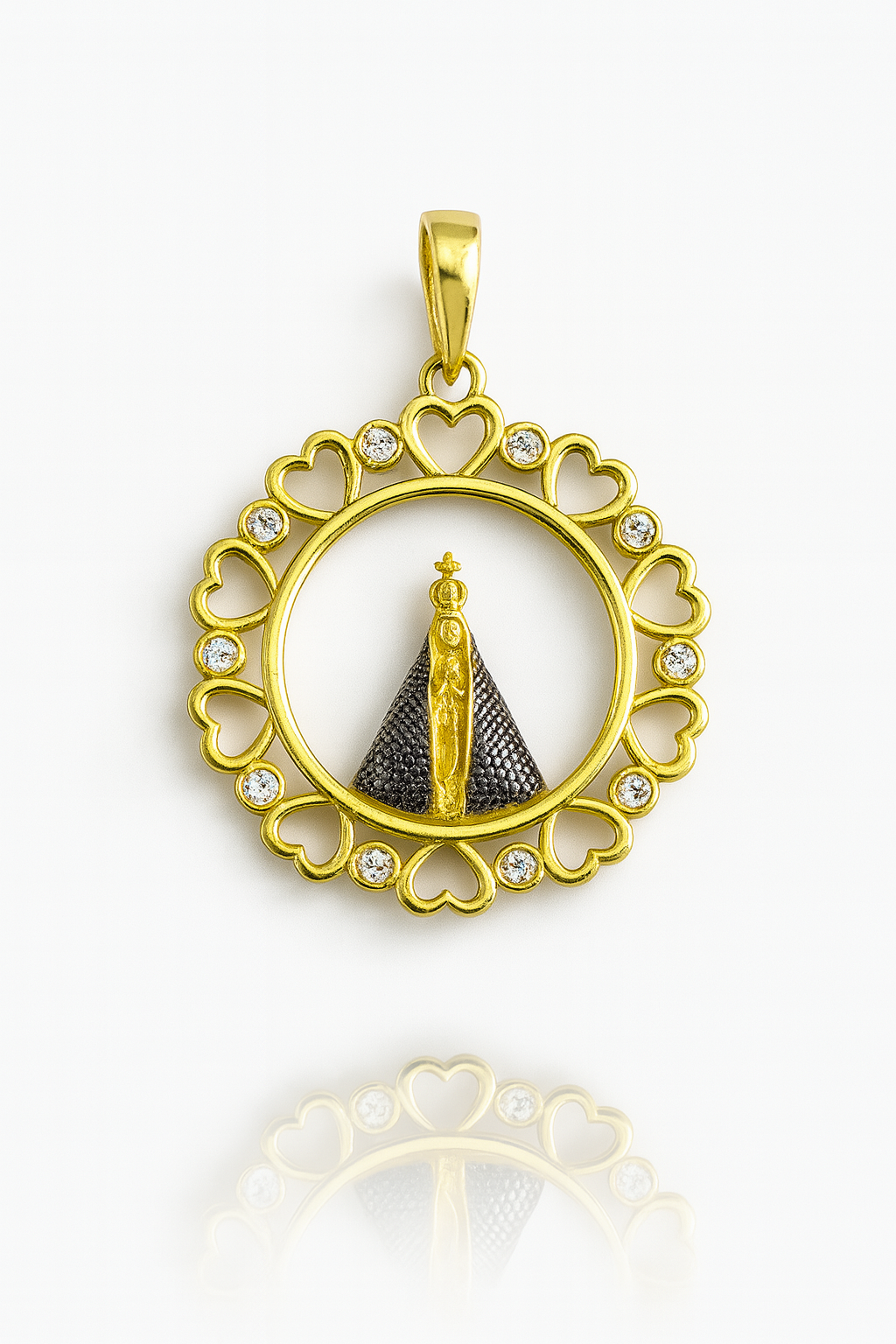 Pingente Nossa Senhora Aparecida em ouro amarelo 18k e ouro branco com zircônias.