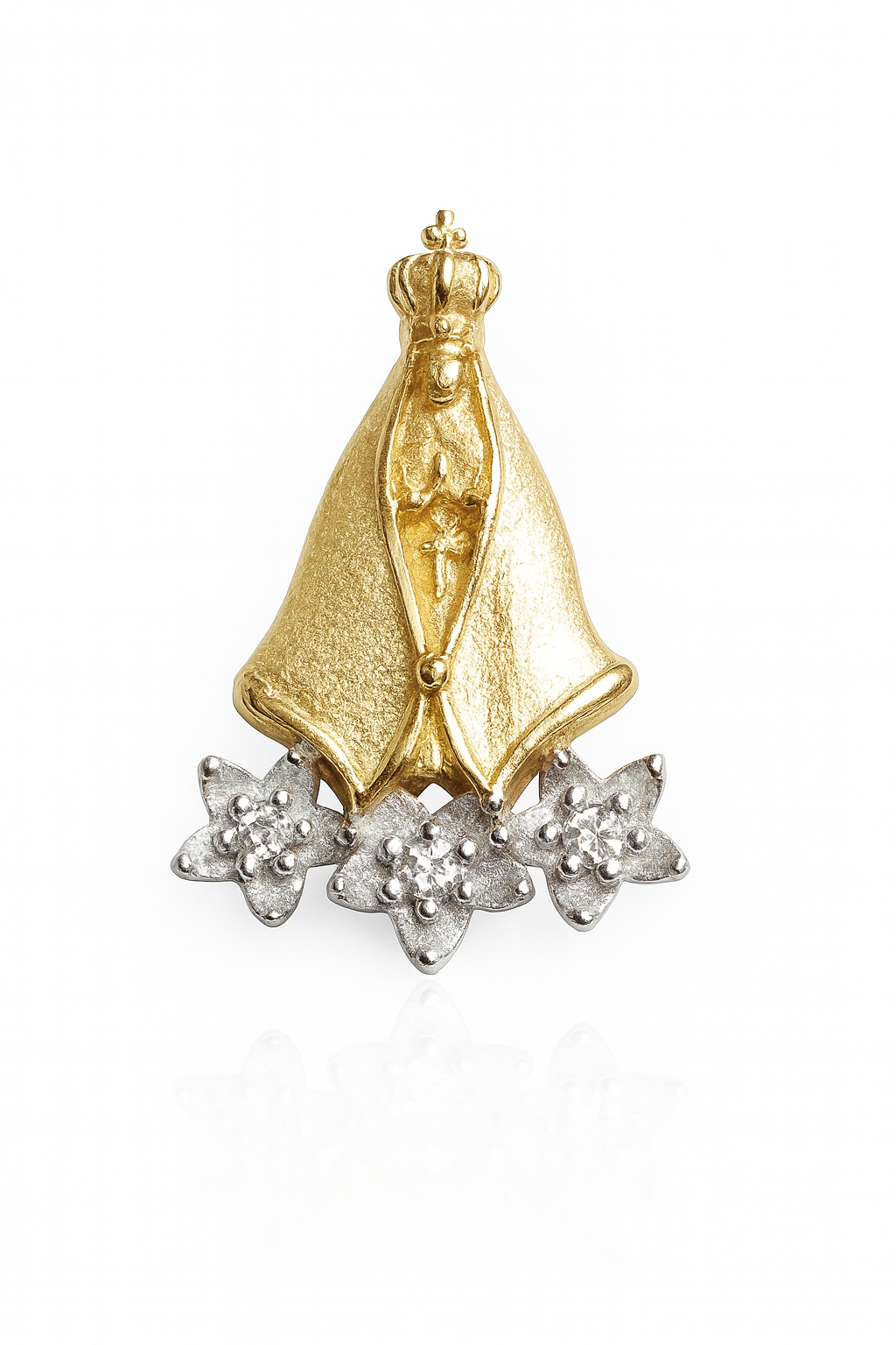 Pingente Nossa Senhora Aparecida em ouro 18k com 3 brilhantes.