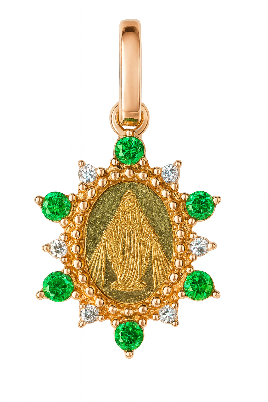 Pingente Nossa Senhora das Graças em ouro 18k com 6 brilhantes e 6 esmeraldas.