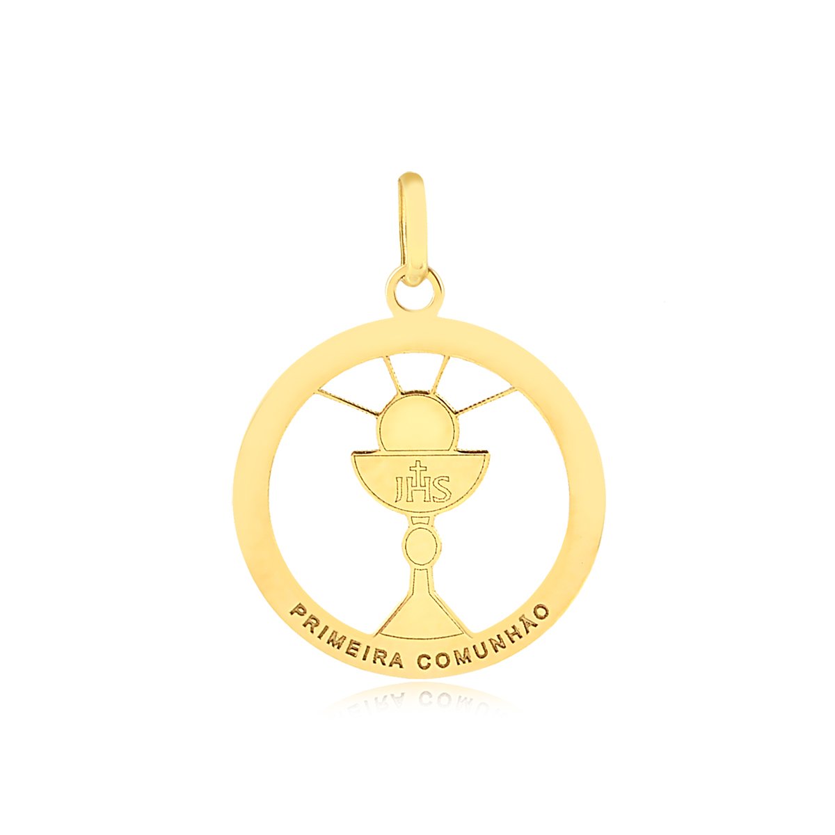Pingente primeira comunhão medindo 15mm de diâmetro em ouro 18k.
